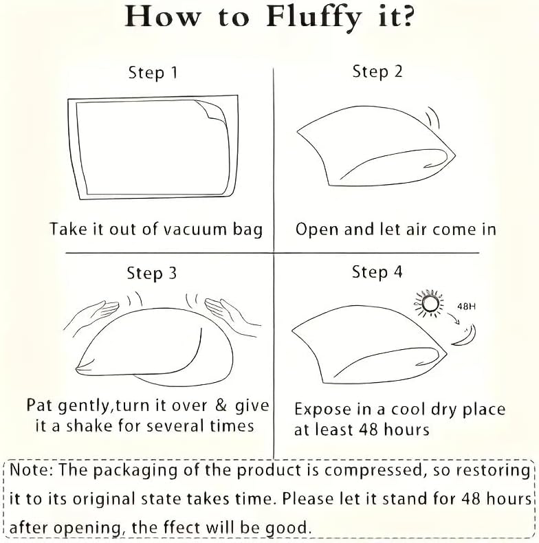 - Matters Need Attention: Our pillows are vacuum-compressed for shipping, so they may appear flat upon arrival. To restore their fullness, simply shake the pillow and let it sit for a few hours. You can also tumble dry it on low heat for a quicker recovery.
