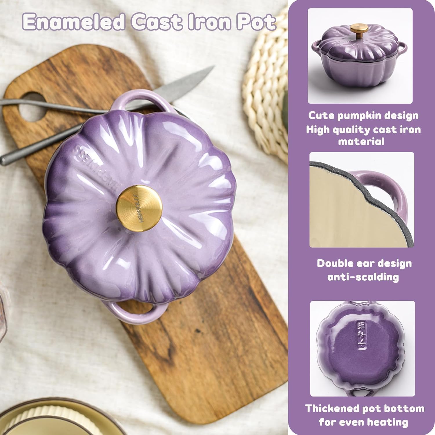 - Enameled Cast Iron Dutch Pot with Lid & Handle: The whole cast iron pumpkin saucepan is smooth and delicate, the bottom of the pot is thickened, the whole enamel glaze design. Each soup bowl is designed with handles for easier removal from the oven or microwave. It is also easier to move when it holds hot food. The lid keeps food warm longer and stay juicy. Serving hot soup in this cast iron bowl with lid preserves the flavor.