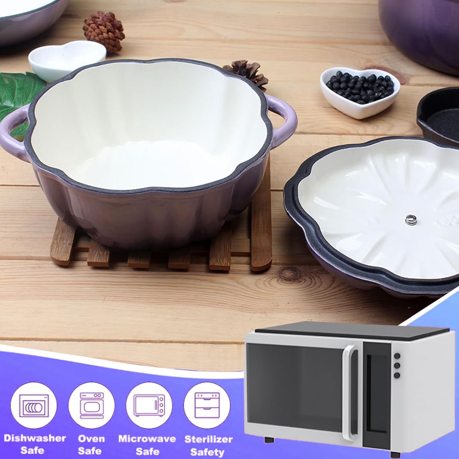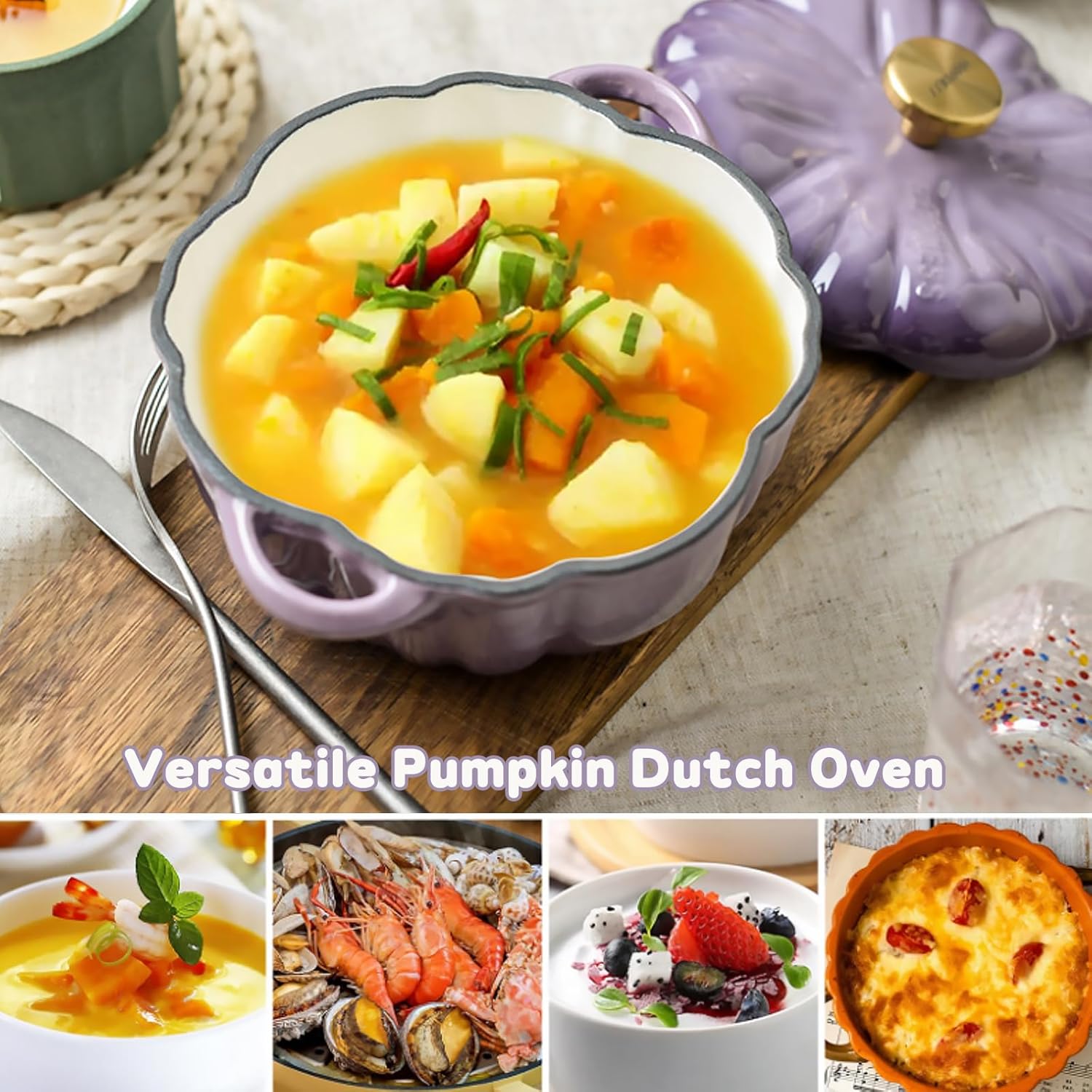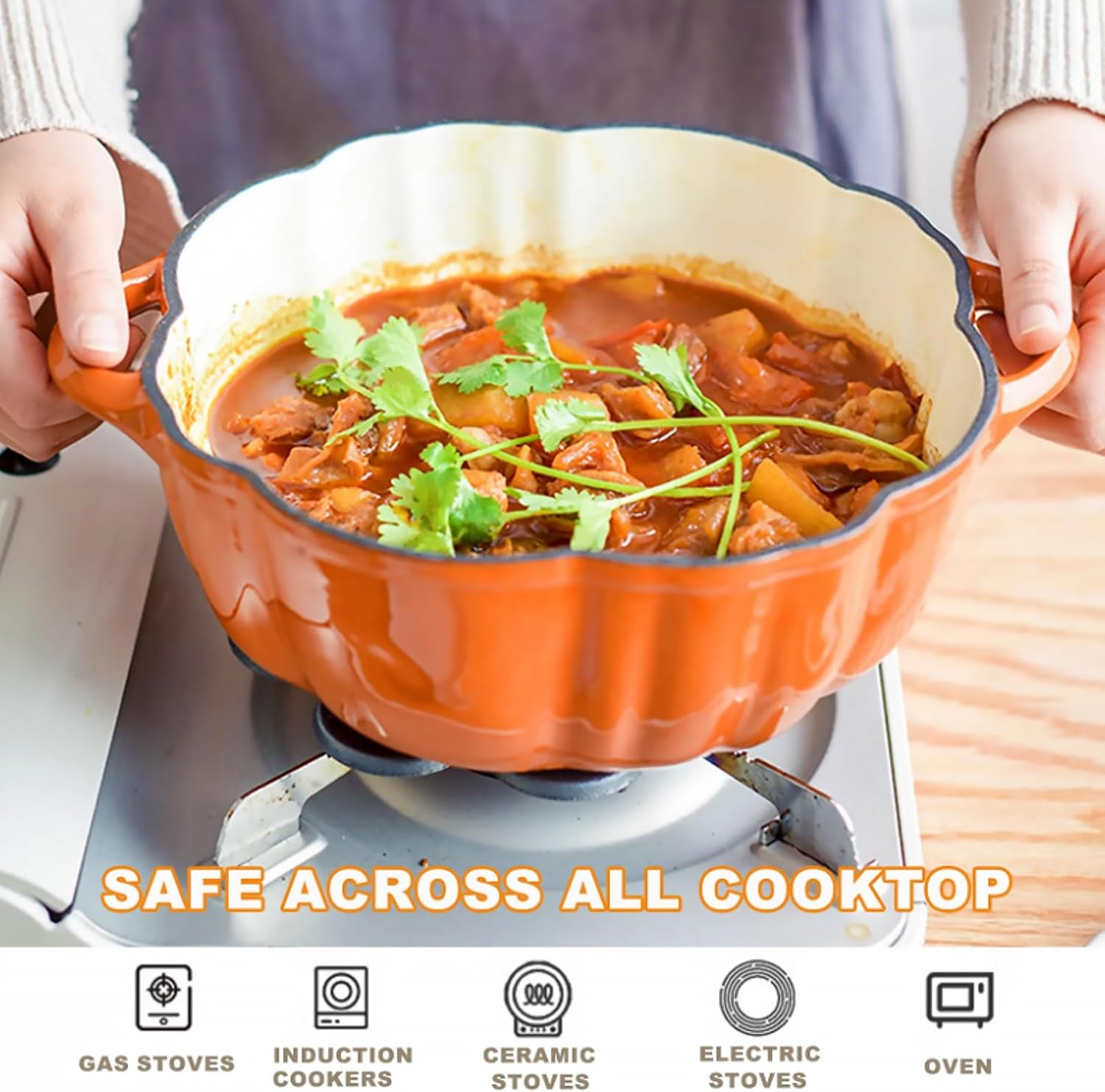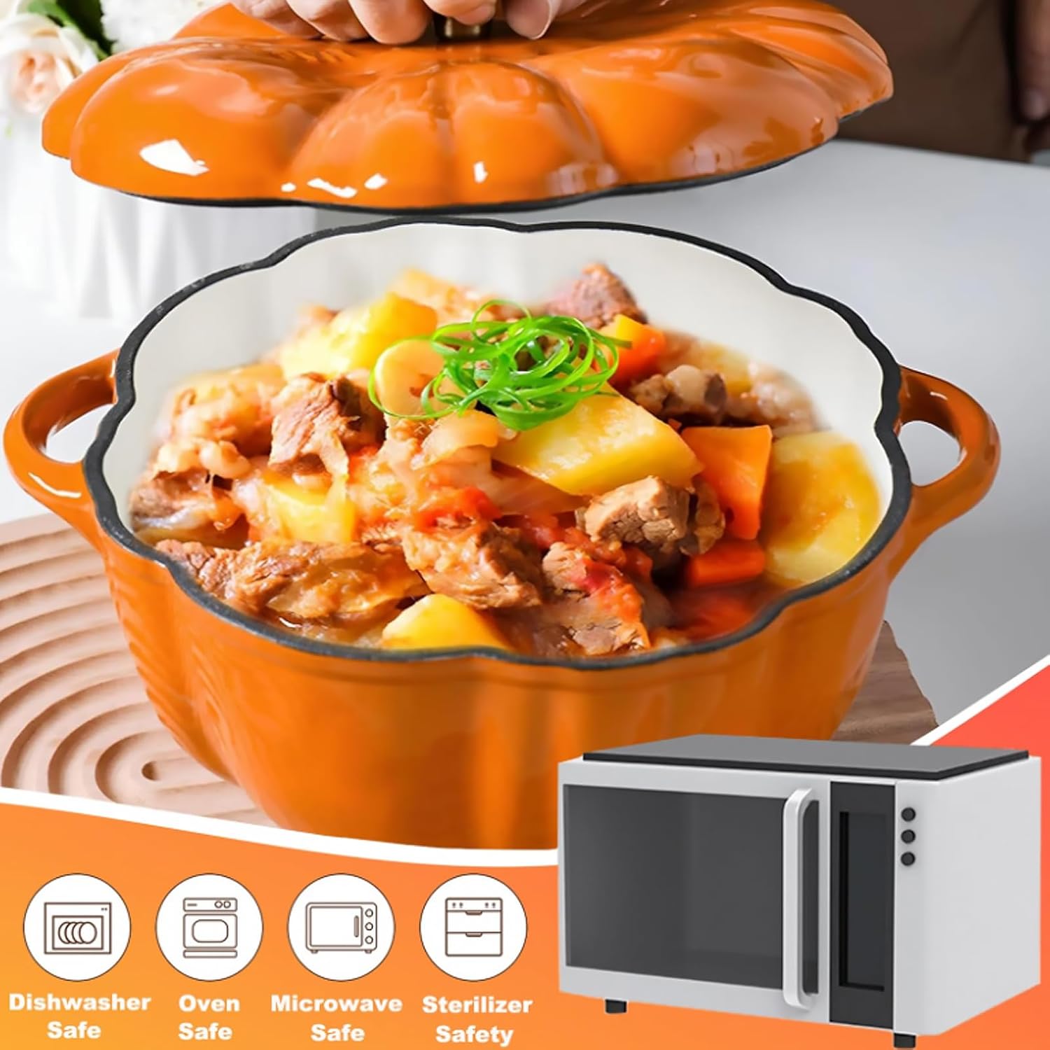 - Nonstick & Easy Cleaning: This dutch oven pot with lid was fired at high temperature with a special process, nonstick and smooth glaze resists sticking or scratching, easy to clean, you can rinse it in warm water with soap to clean up or just put it in dishwasher (except the lid). Cast iron pumpkin bowl safe in microwave, oven, dishwasher and freezer. Suitable for gas, induction, electric ceramic, infrared and other stoves.