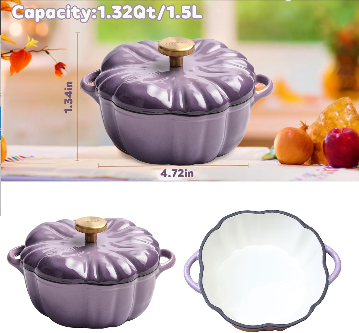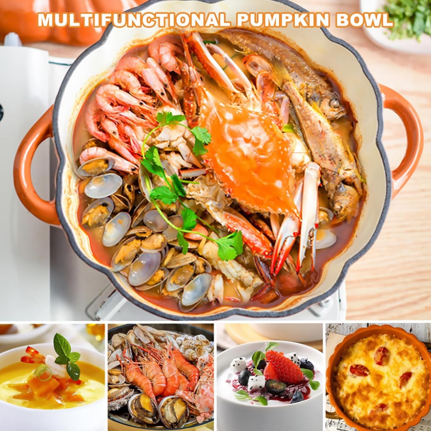 - Multifunctional Kitchen Cookware: Pumpkin pot size 8.26(L)×8.26(W)×3.14(H) inch, Capacity: 1.32 Quart. Perfectly sized pumpkin dutch oven for multiple uses, can be used in the oven or microwave to bake or make desserts, or to make other delicious dishes, stews, and to hold various fruits, pickles, olives, nuts, dipping sauces and soft cheeses, etc. Can also be used as a Halloween candy bowl.