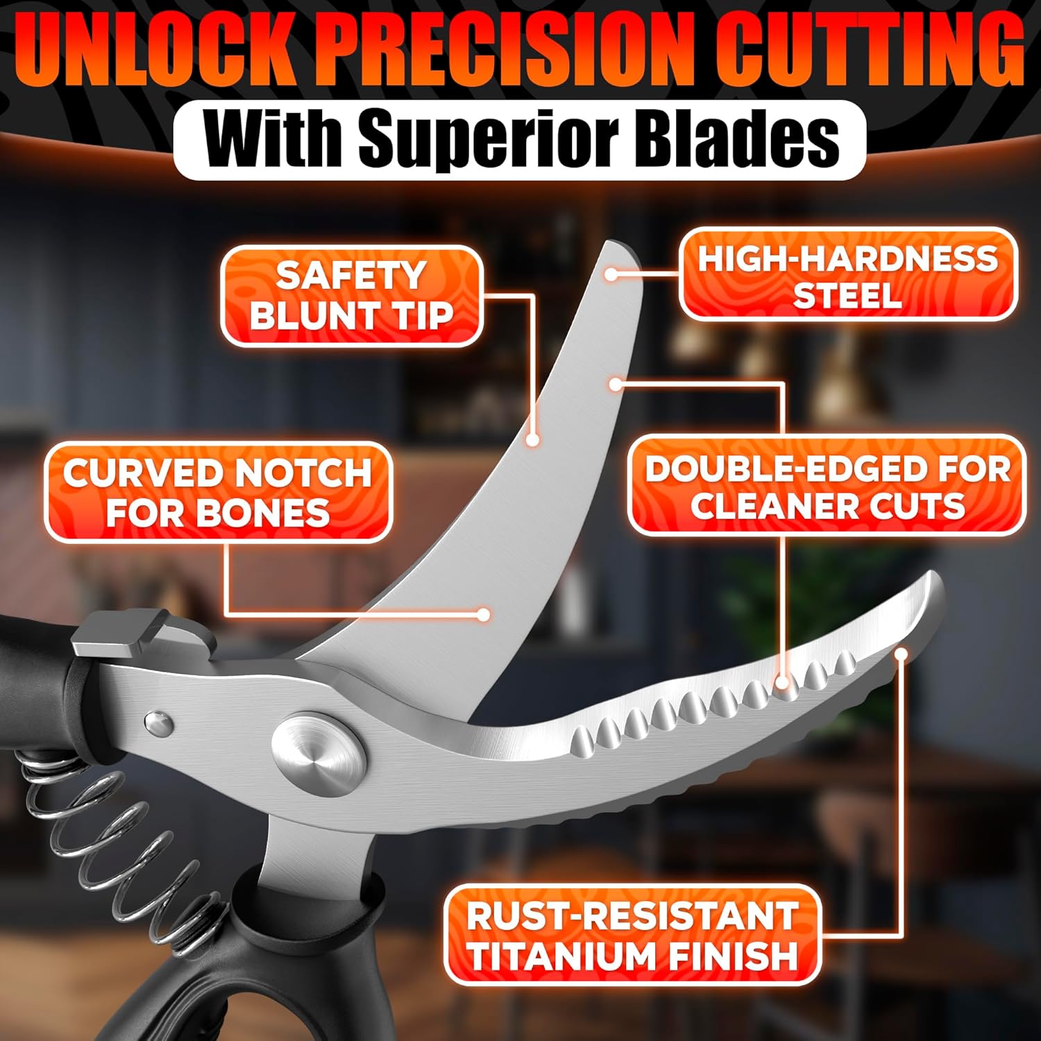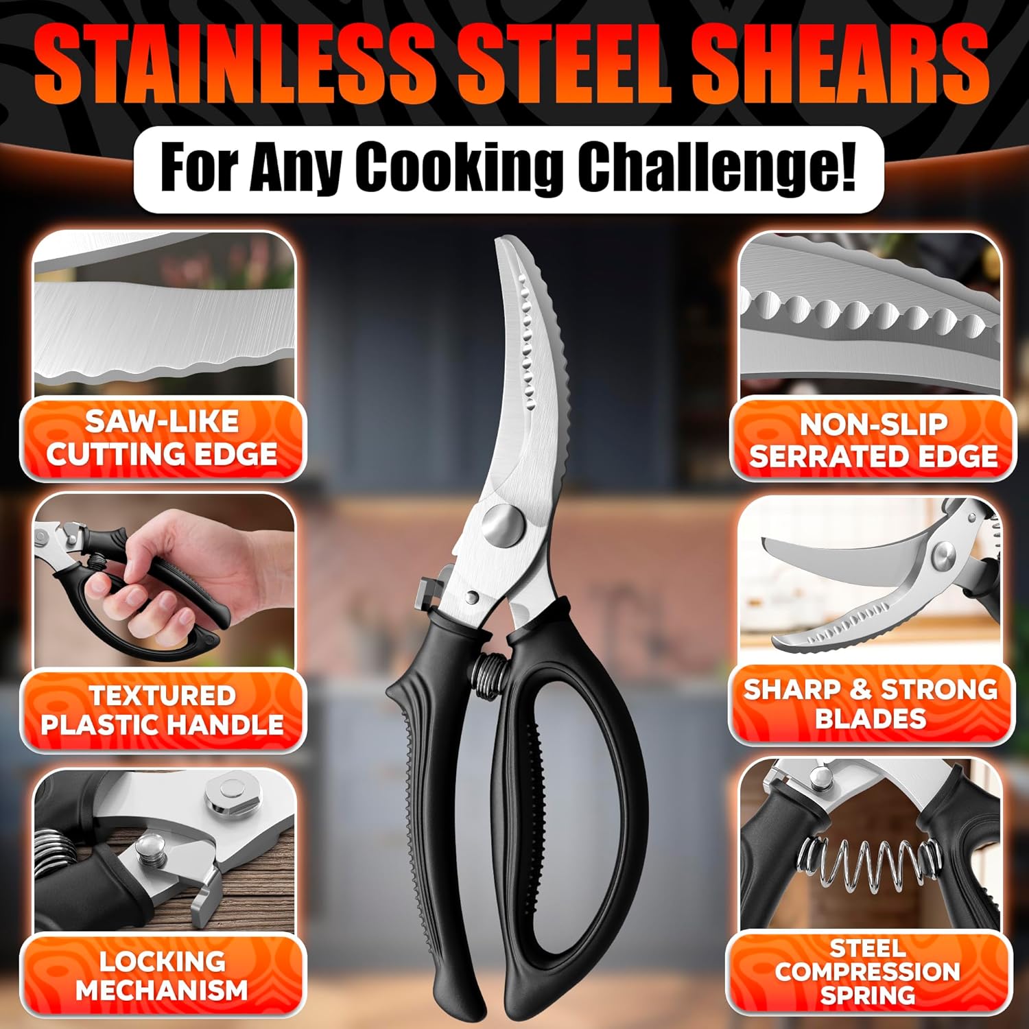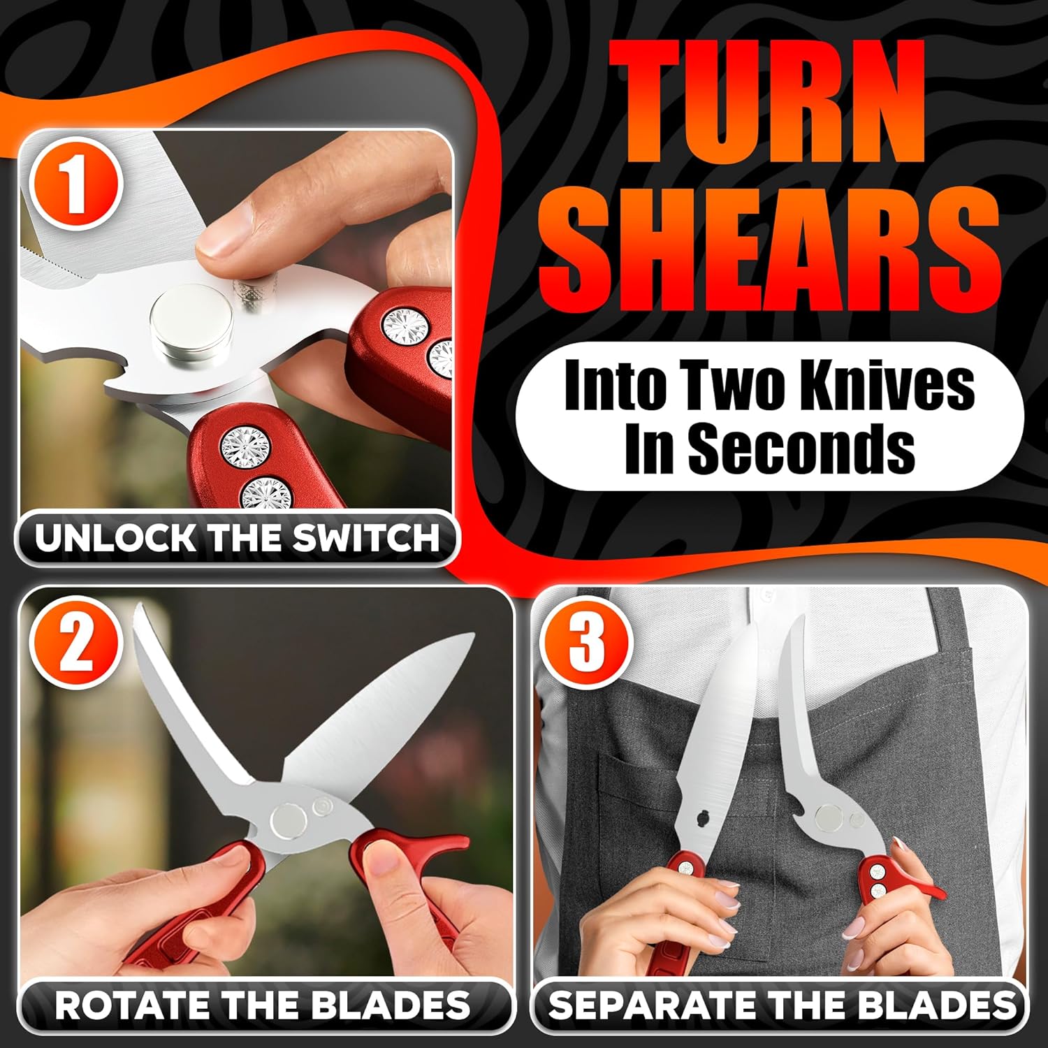 - Knife Scissors with Safety Lock: The 2 in 1 kitchen scissors & produce scissors kitchen has a safety latch to prevent accidental cuts. Lock blades when chopping scissors for food are not in use